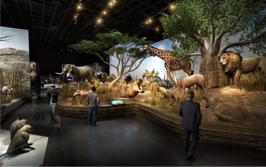 两侧展柜复原了沙漠和雨林场景