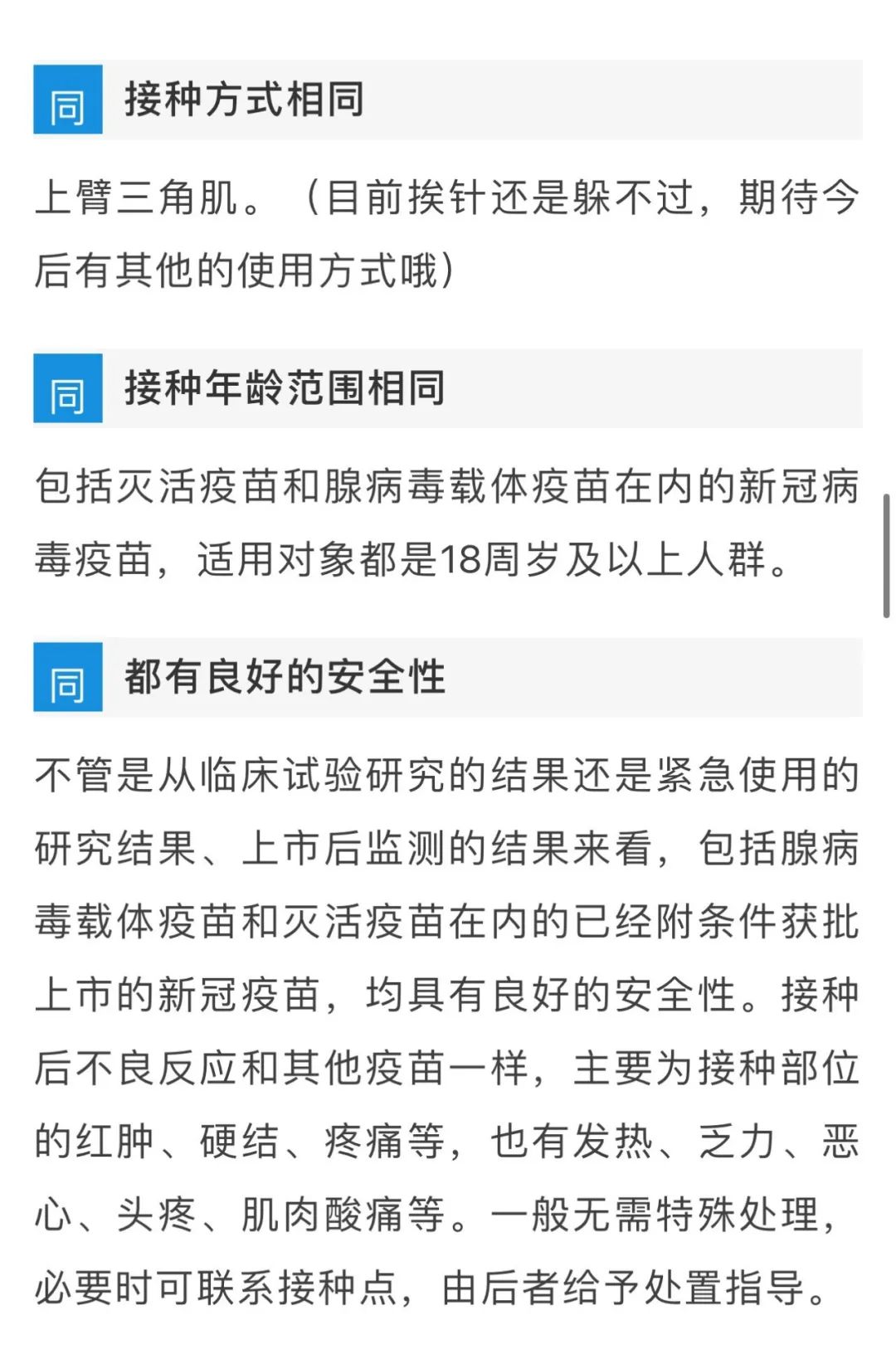 答:现阶段建议用同一个疫苗产品完成接种。接种过1剂灭活疫苗者,建议使用灭活疫苗完成全程接种;已经接种完2剂灭活疫苗者,暂不建议使用腺病毒疫苗加强。