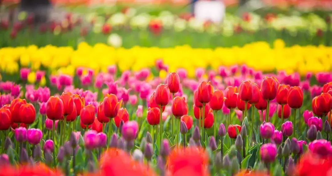 各色郁金香成阶梯状分布在花田中,50多个品种,上百万株郁金香,典雅高贵的纯白、绚丽明亮的黄,鲜艳欲滴的红,唯美温馨的红白色王朝郁金香,绚丽的花朵是春天的气息!