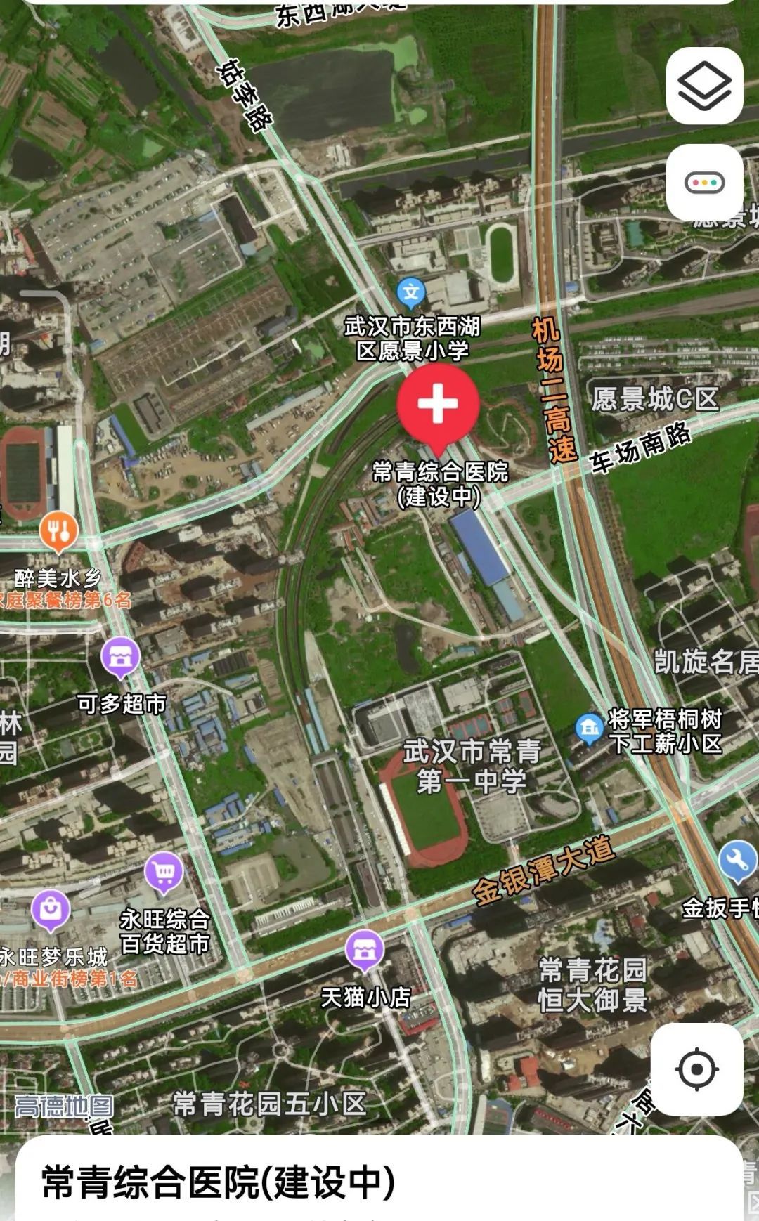 在建的常青花园综合医院,位于地铁2号线金银潭站北侧,东临姑李路,南临金银潭大道。占地面积3.5万平方米,建筑面积近10万平方米,总投资7.52亿元,设计床位500张。