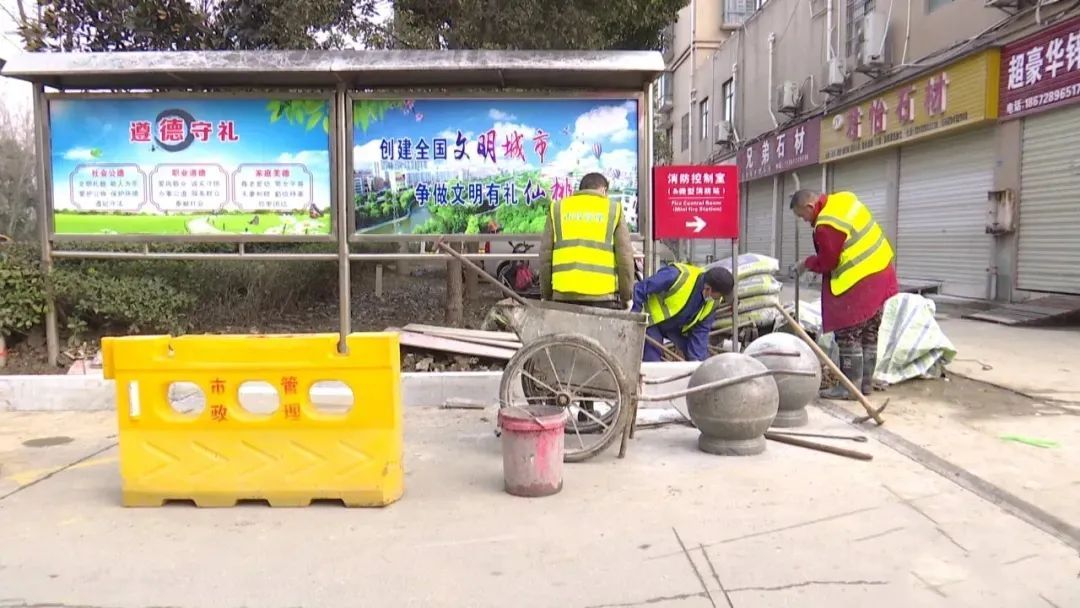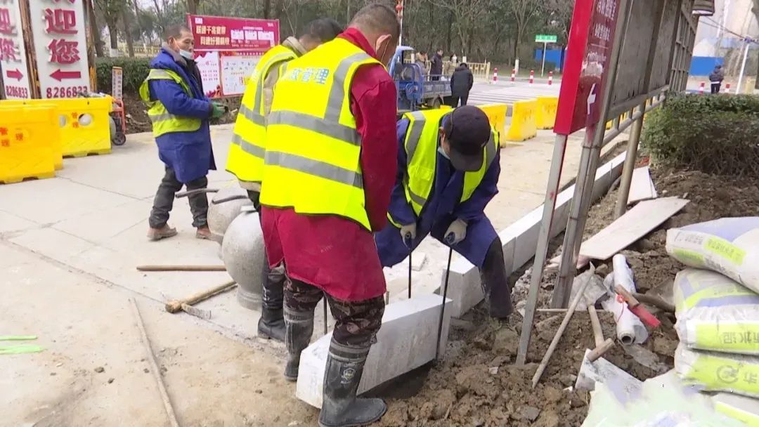 复州大道上破损花坛的修补工作