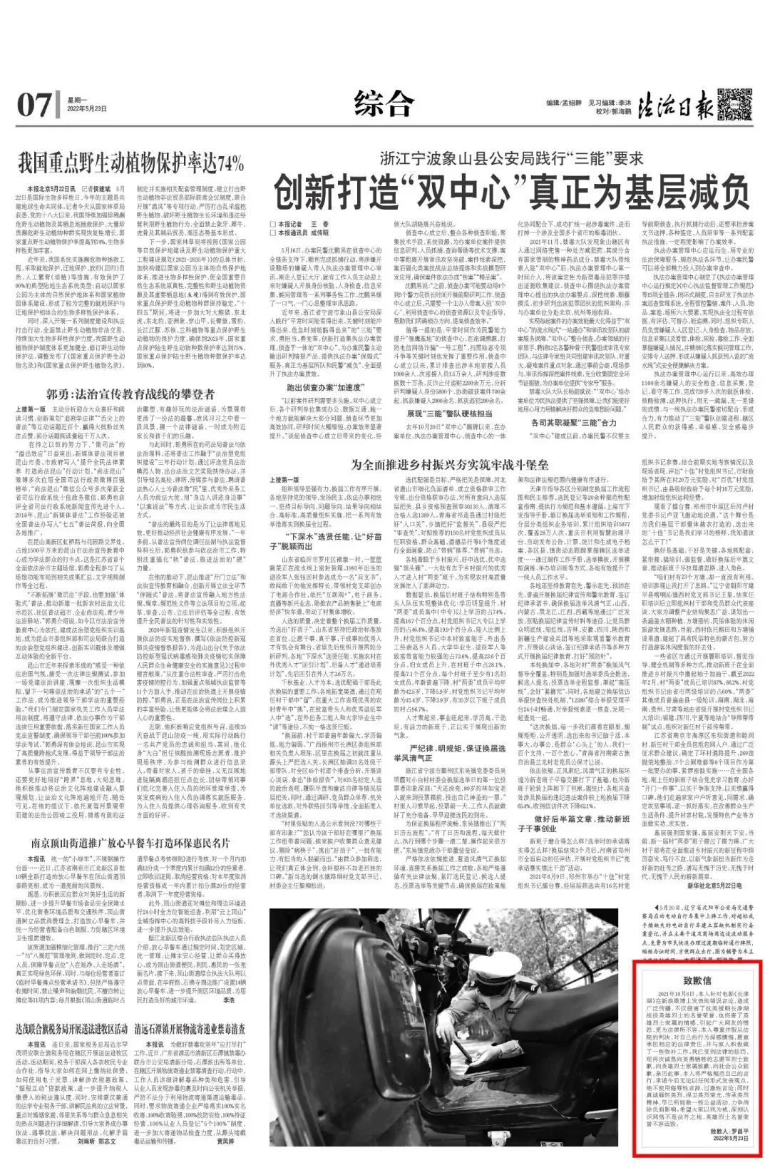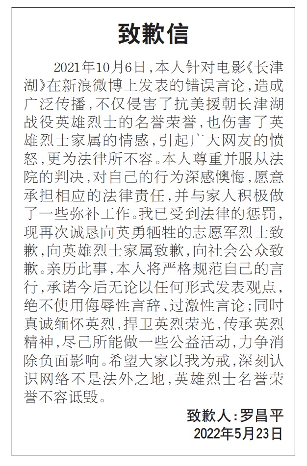 记者从法治日报社获悉,备受关注的网络大V罗昌平侮辱英烈案宣判后,5月21日下午罗昌平委托代理人主动联系报社广告部就法院判决其在《法治日报》等媒体上公开赔礼道歉等履行民事责任,5月23日出版的《法治日报》7版刊发了其致歉信全文。