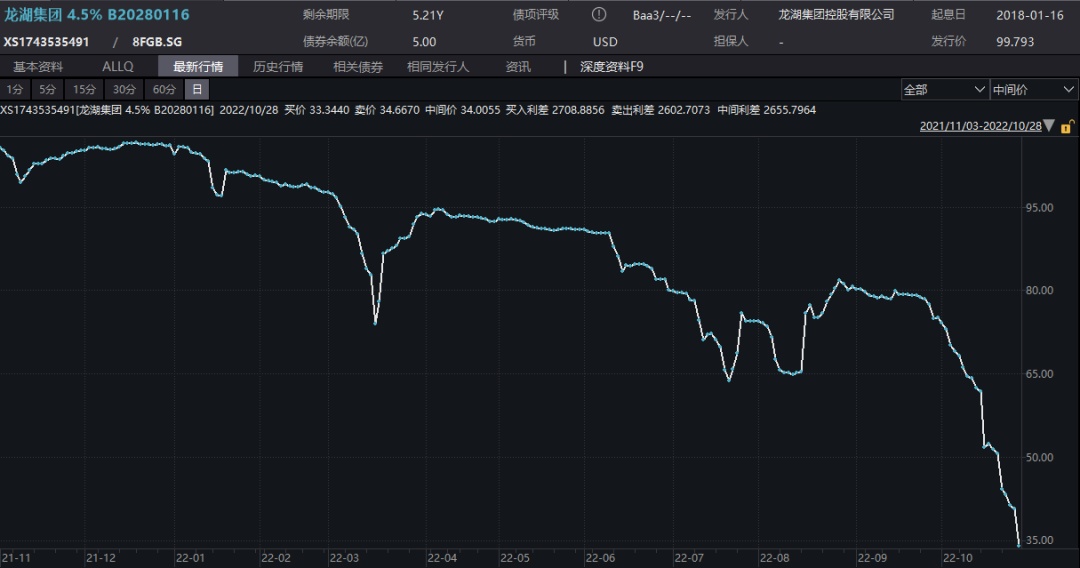 龙湖2028年到期、利率4.5%的美元债盘中一度下跌12.6美分至20.1美分。截至发稿,报35美分。