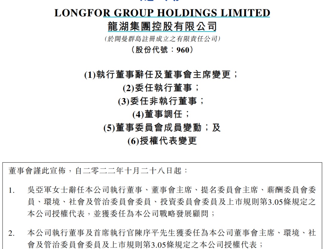 10月28日晚间,龙湖集团发布人事变动公告。公告显示,吴亚军因个人年龄及身体原因而呈请辞任公司执行董事、董事会主席、提名委员会主席、薪酬委员会委员、环境、社会及管治委员会委员、投资委员会委员及公司授权代表,并获委任为公司战略发展顾问,自2022年10月28日生效。