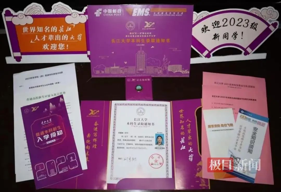 长江大学2023年本科生录取通知书大礼包以紫色、金色和长大蓝为主色调,突出长江大学合并组建20周年,暨高水平大学建设主题,展示学校校园文化、育人精神和价值追求。封套有长江大学校徽、长江大学合并组建20周年LOGO、金钥匙形状“2023本科生录取通知书”字样、校风“求实、进取、创业、报国”、手绘西校区大门、麦穗、校园风景图等。