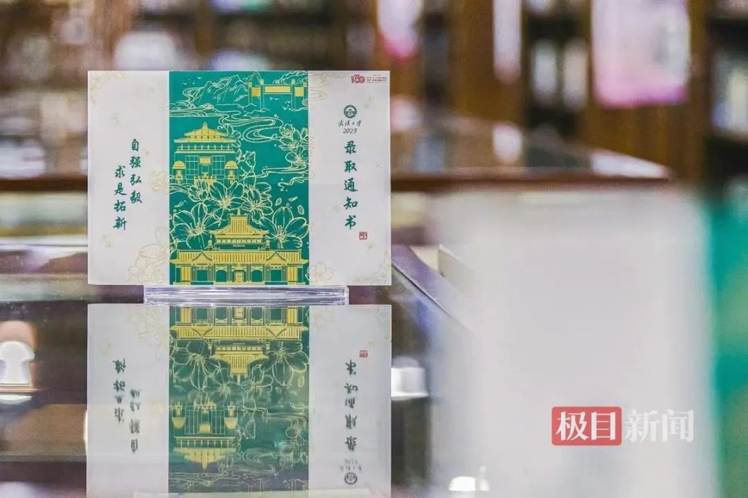 今年是武汉大学建校130周年。录取通知书封面采用青绿色和白色结合,用烫金勾绘学校特色建筑,包括学校行政楼,具有武大特色的樱花,老图书馆,以及珞珈山。四角重檐攒尖的行政楼,无论风和日暄,又或星前月下,岿然而立,百年不变,凝聚天地灵气,孕育代代珞珈人。中西合璧矗立山顶的老图书馆掩映于樱花之中。封面还印有学校校训:自强、弘毅、求是、拓新。