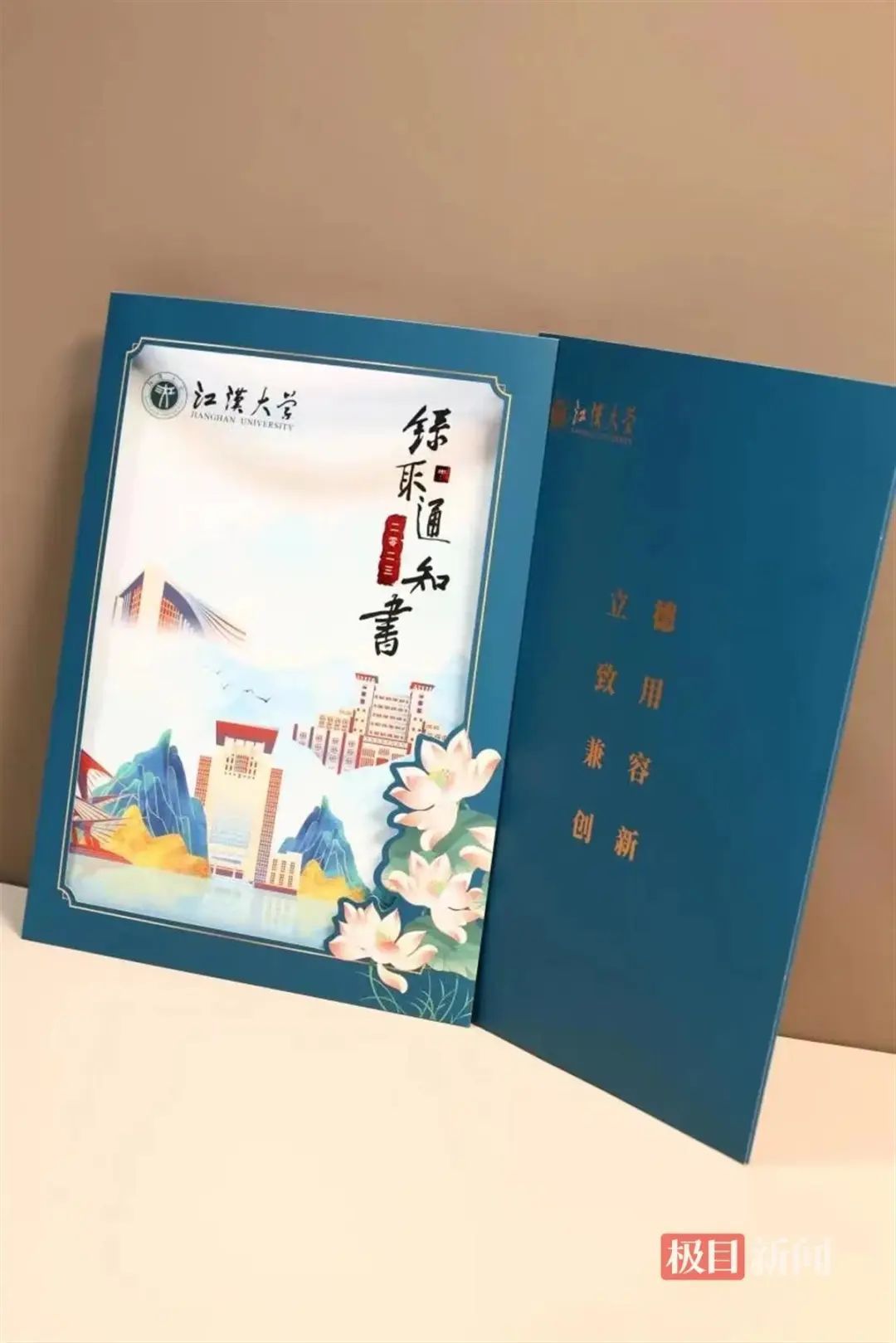 2023年江汉大学的录取通知书以“湖畔印彩”为设计概念,整体以“画框”的形式呈现。主色调以江大蓝为主,典雅且富有朝气。封套和内芯用抽拉形式组合,采撷几枝三角湖的荷花,装饰在封套的外框。内芯将学校建筑融入山水环境,层次色彩细腻丰富,清雅高洁的荷花与校园景色交相辉映。通知书的内页,以江大蓝为底色,与封面相呼应。