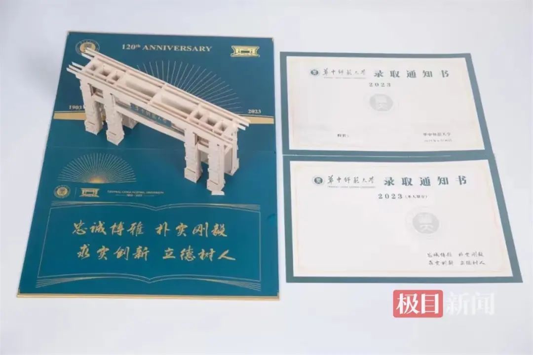 今年,华师迎来120周年校庆,华师将学校代表性建筑之一的南门作为标识放入录取通知书中。打开通知书的第一时间,入眼即是激光雕刻拼装构成的立体华中师范大学南门模型。让新生们“未至华师大 先闻华师韵”。今年华师的录取通知书以华师绿与金色为主色调,顶部华师校徽 底部书页造型,以横开本形式折叠。华中师范大学校长郝芳华介绍,“打开之后是激光雕刻拼装的华中师范大学南门立体模型 ,恢宏稳健、高雅庄重,华大绿既是底色,又寓意捷报自绿意盎然的华师校园传来,烫金字样含金榜题名之义。同时,祈愿新生的大学生活熠熠生辉。”
