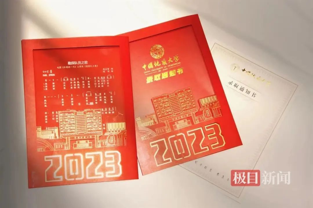 2023中国地质大学(武汉)本科录取通知书由封套和正本组成,封套采用了镂空激光雕刻工艺,第一层为“南望山校区主体建筑”,第二层为“未来城校区主体建筑”。整体为“视窗化”的表现形式,轻启封套,如透过“南望视窗”和“未来视窗”,一份轻盈却厚重如山的正本录取通知书跃然纸上。正本通知书采用金色烫印工艺,“艰苦朴素,求真务实”的校训让每位学子都印刻在心中。