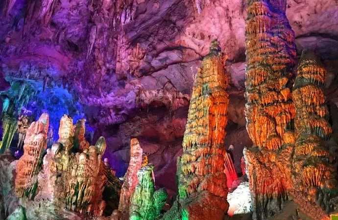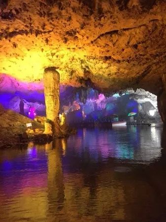 隐水洞全长5180米,分上下两层,历经百万年演变,大自然的鬼斧神工在这里造化出了一个奇幻的洞中世界。隐水洞的浏览方式也甚为独特:上游1/3乘船观光、中游1/3乘火车游览、下游1/3徒步。“神奇隐水洞,十里水画廊”,洞内流水潺潺,碧潭清澈,轻舟荡漾,如入仙境,还有宏大的钟乳石造型,流光溢彩。