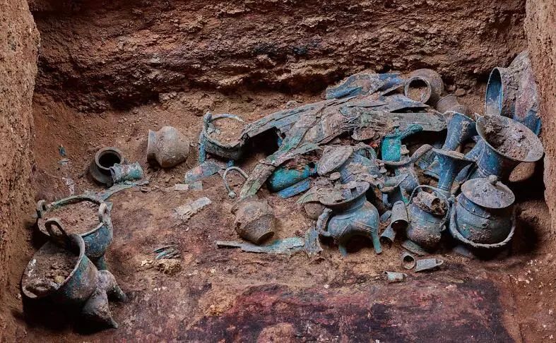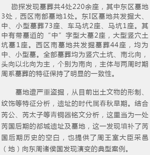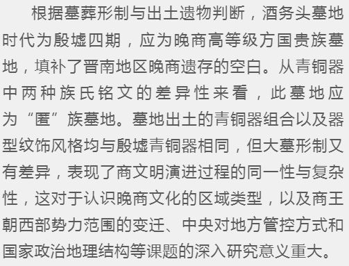 在闻喜酒务头5500平方米墓地范围内发现商代晚期墓葬12座,其中5座甲字形大墓,车马坑6座以及灰坑5个,共出土铜、玉、陶、骨等各类材质的文物500余件(组),加上正在陆续追回的被盗文物,该墓地随葬文物数量可能达数千件。