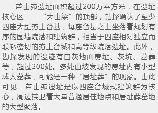 房址、院墙、广场的夯土中,多次发现玉器奠基的现象;在大型房址附近堆积中发现有一定数量的筒瓦及槽型板瓦,个体超过100件,是中国目前所知最早的瓦。