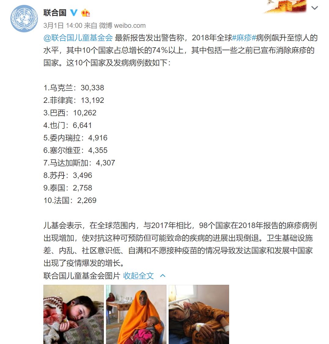 @联合国儿童基金会 最新报告发出警告称,2018年全球#麻疹#病例飙升至惊人的水平,其中10个国家占总增长的74%以上,其中包括一些之前已宣布消除麻疹的国家。