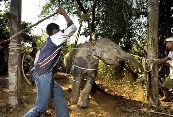 之后,为让小象屈服,他们开始动用棍子、斧子、尖钩等一切手段让它们感到恐惧。