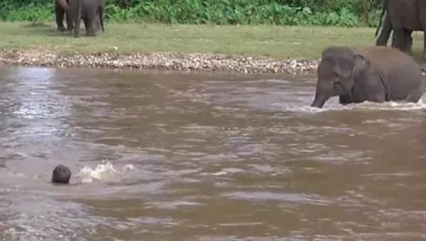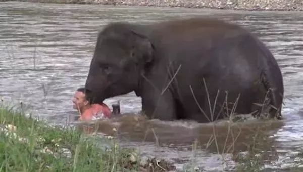 和自己朝夕相处的工作人员溺水,大象幼崽不顾一切冲入水中营救。