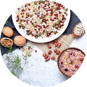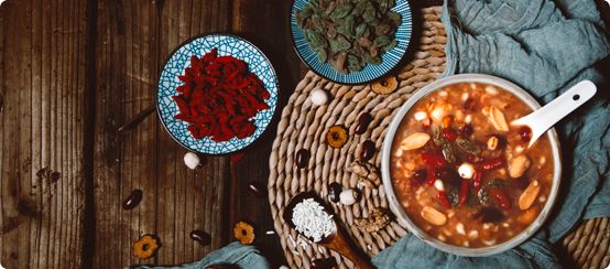 不同地区腊八粥的用料虽有不同,但基本上都包括大米、小米、糯米、高粱米、紫米、薏米等谷类,黄豆、红豆、绿豆、芸豆、豇豆等豆类,红枣、花生、莲子、枸杞子、栗子、核桃仁、杏仁、桂圆、葡萄干、白果等干果。腊八粥不仅是时令美食,更是养生佳品,尤其适合在寒冷的天气里保养脾胃。