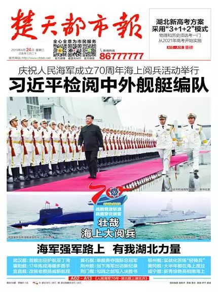 今年是新中国成立70周年,也是人民海军成立70周年。在这个特殊的海军节,楚天都市报联合湖北省军区、省退役军人事务厅,推出大型特刊《湖北舰上湖北兵》。本报多路记者分赴东海、南海、北海,带着湖北人民的问候登上“湖北舰”,感受到舰上官兵对于第二故乡的热情,也领略到大国海军的自信与力量。