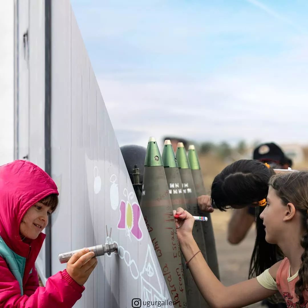 右边的女孩们在2006年以色列-黎巴嫩战争期间,向炮兵部队的炸弹发送信息;左边的小女孩因战争而不得不逃离自己的国家,她们正在希腊难民营的墙上涂鸦。