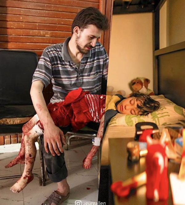 这张拼接图实在太震撼了!左边的新闻图片曾获得2015年法新社年度图片奖。一名叙利亚男子看着他在空袭中丧生的女儿欲哭无泪——