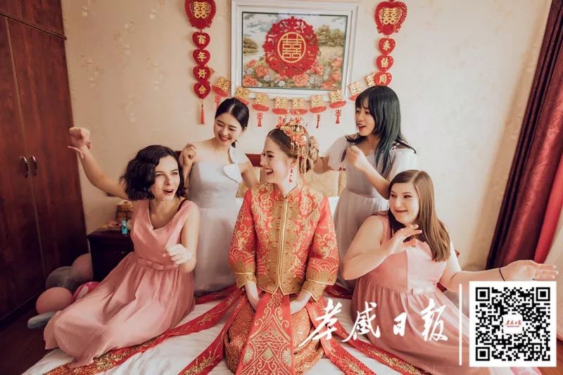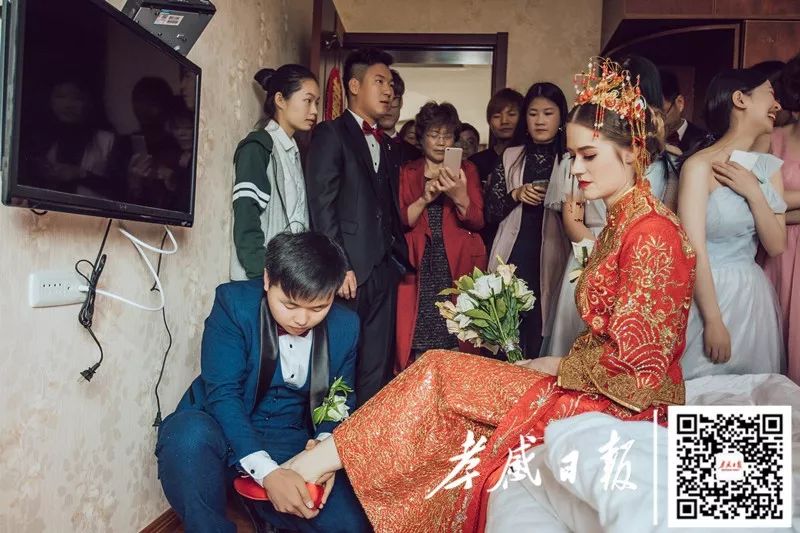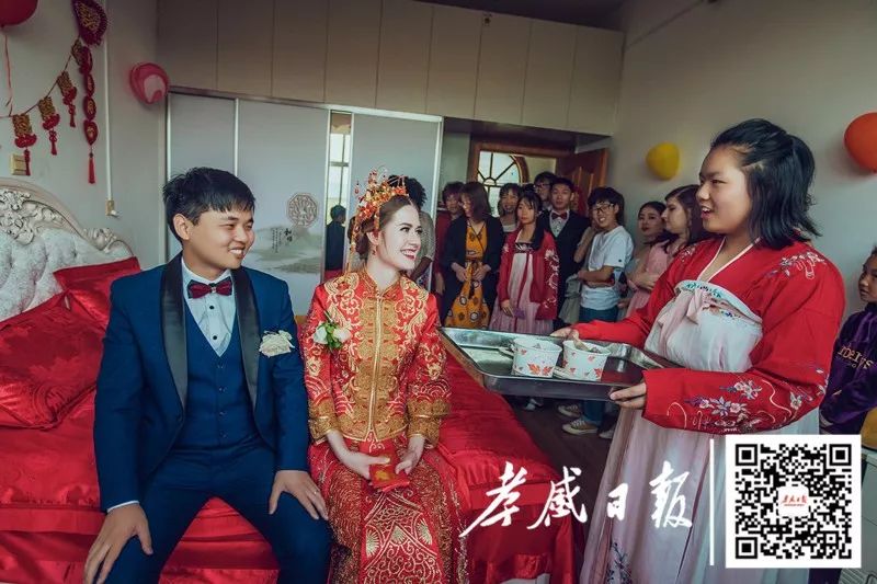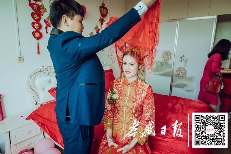 婚礼当天,张灯结彩。新娘穿着传统喜服,盖着红盖头。按照传统中国婚礼习俗,接亲,拜天地,给父母敬茶,掀盖头,喝交杯酒……现场气氛热闹,喜气洋洋。