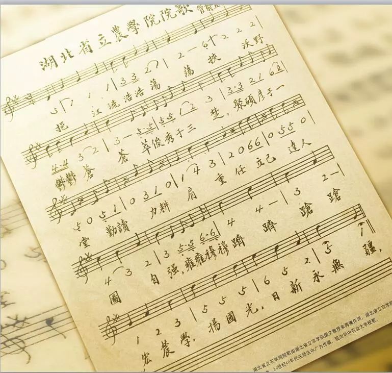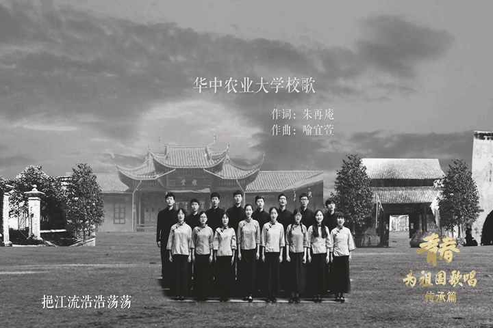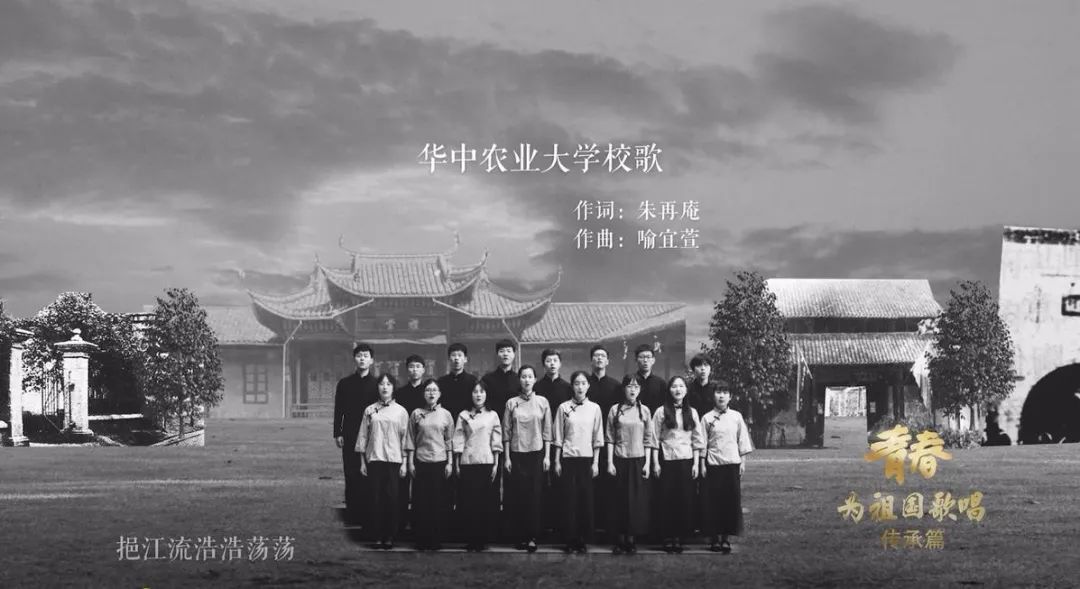 抗日战争时期,湖北省立农学院(我校前身之一)西迁鄂西山区,全体师生筚路蓝缕,坚持办学。时任教务长的包望敏教授曾在《论“耕读”与“新农”》一文中写道:“湖北省立农学院创立于烽烟遍地,万方多难之日,集海内农学者及三楚青年一堂,朝夕孜孜,耕读不辍,以革新农业为己任,其坚苦卓绝之精神与乎兴农建国之宏愿均有足多者。”抗战胜利后,学校迁回武汉,国文教授朱再庵和著名音乐教育家喻宜萱带着对鄂西山区办学经历的深刻体验和无限感慨,共同创作了《湖北省立农学院院歌》,书写了全校师生的光荣与梦想,立即广为传唱。2006年3月该歌曲被确定为学校校歌。
