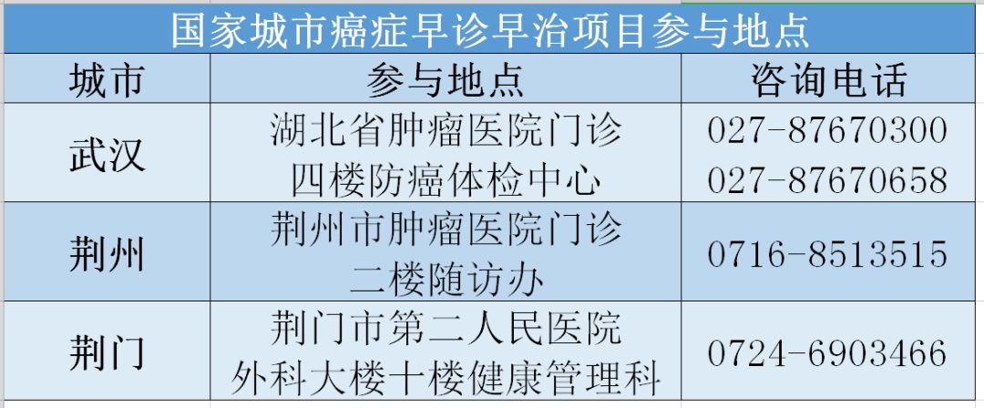 6月30日前,凡武汉、荆州、荆门市户籍人口及常住人口(当地居住满三年以上),40-74岁居民(非恶性肿瘤确诊患者、非其他严重内外科疾病正在治疗者),均能参与该项目,有意者可携带本人身份证,到指定地点填写调查问卷,一旦被评估为高风险,即可到指定医院进行相应项目的免费检查。