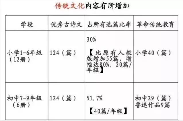 整个小学6年12册共选优秀古诗文124篇,占所有选篇的30%,比原有人教版增加55篇,增幅达80%,平均每年20篇左右。初中古诗文选篇也是124篇,占所有选篇的51.7%。