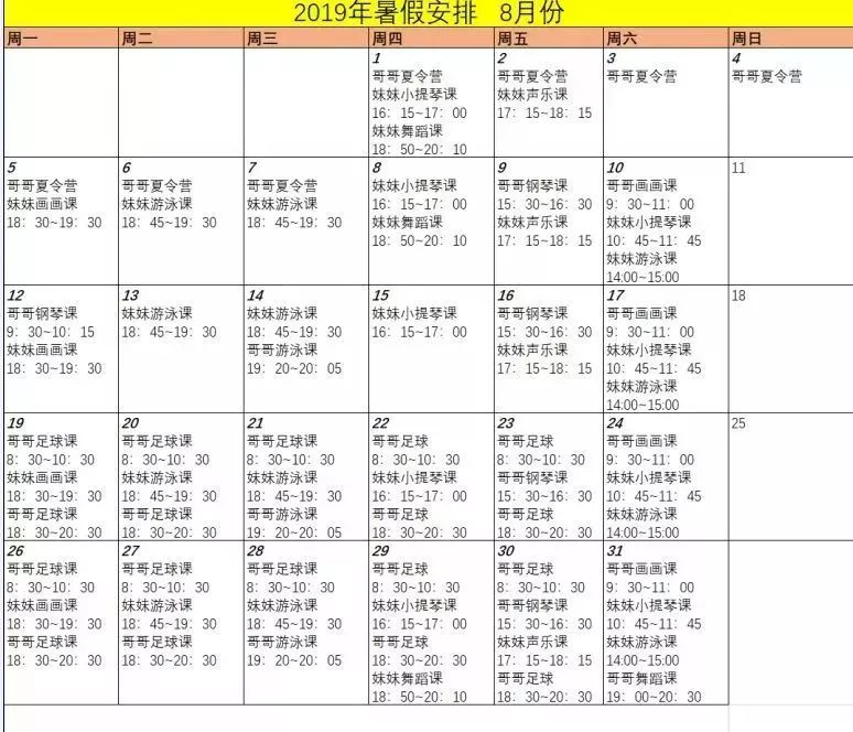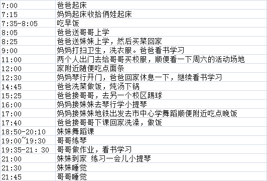 “哥哥夏令营、妹妹小提琴、妹妹舞蹈、哥哥足球、妹妹声乐、哥哥钢琴、哥哥乐理课……”