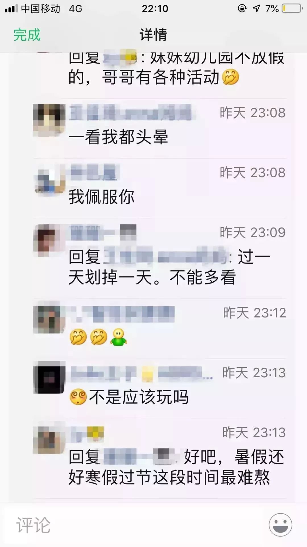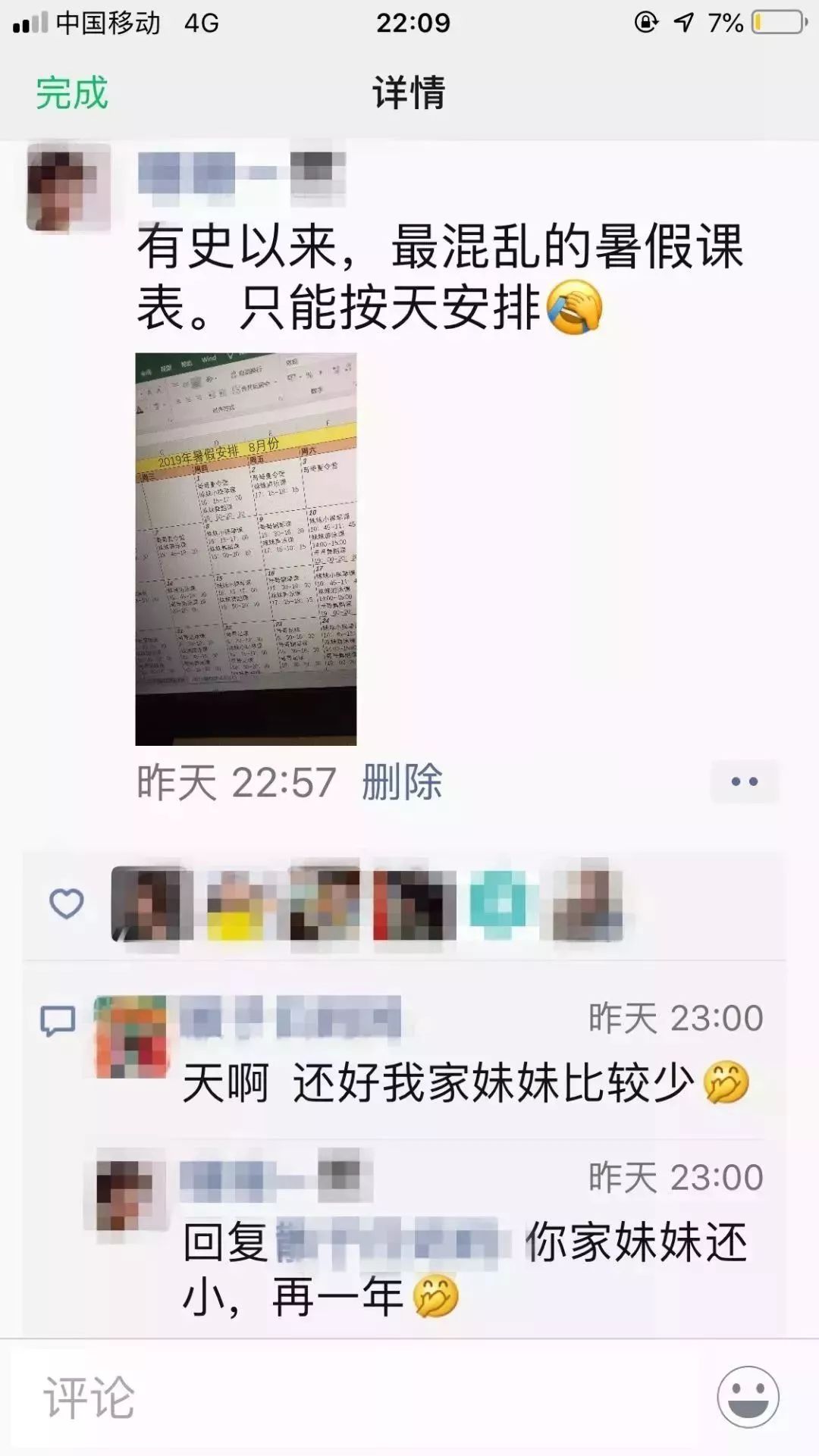 这位二娃妈妈有一儿一女,儿子现读小学一年级,女儿则尚在幼儿园中班,这么大的娃,一个暑假除了8天旅游,其余时间则被满满当当的培训课占满,令人不得不感叹一句,“孩子们好累啊!”