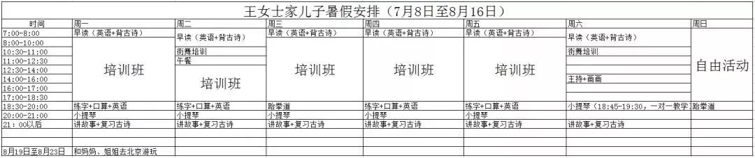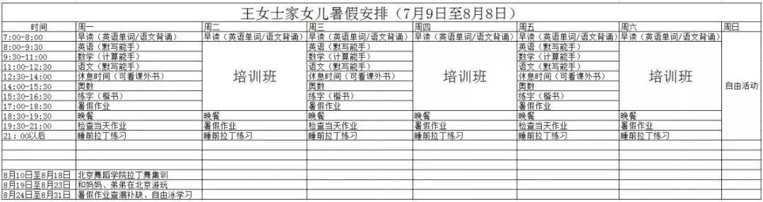 先看女儿的行程,从7月9日至8月8日,每逢周二、四、六,从8:00-17:30,都将在培训班里度过,课程分为语文、数学、英语、奥数,回家吃完饭后,19:30-21:00,做暑假作业,21:00-睡前,拉丁练习。