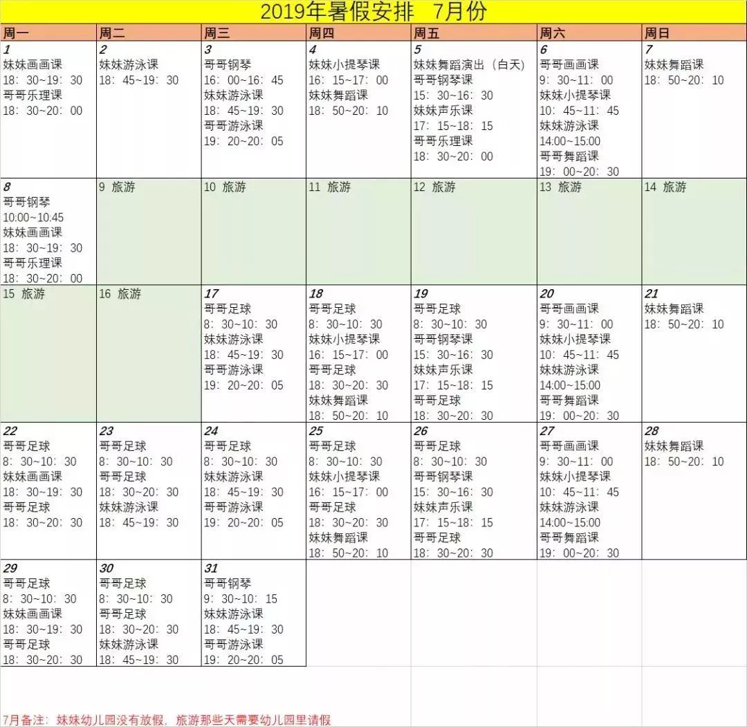 记者整理了她家妹妹暑假的“行程安排”,一共要学5种课程,画画、游泳、小提琴、舞蹈和声乐,7月和8月每周7天的安排如下: