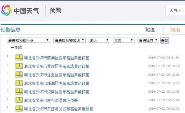 在20分钟内,武汉气象部门连发7条高温黄色预警,涉及蔡甸区、黄陂区、江夏区、新洲区、汉南区、东西湖区以及中心城区。 高温黄色预警的标准是连续三天日最高气温将在35℃以上。