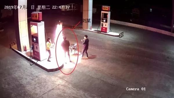 酒足饭饱后,刘某搭表弟所骑的摩托车准备回家,看到摩托车快没油了,两人来到就近的加油站加油。此时,无处发泄的刘某看到加油站女员工独自一人在加油,就在酒精的刺激下,做出了“调戏”和纵火的冲动举动。