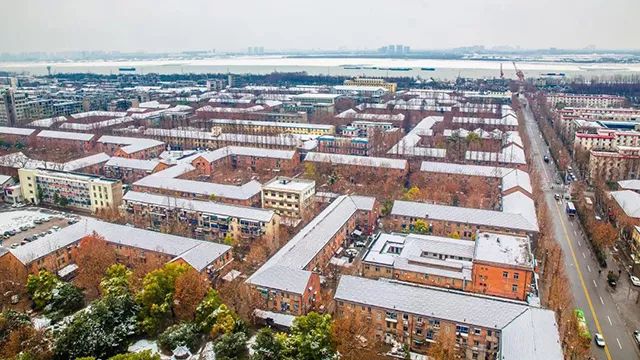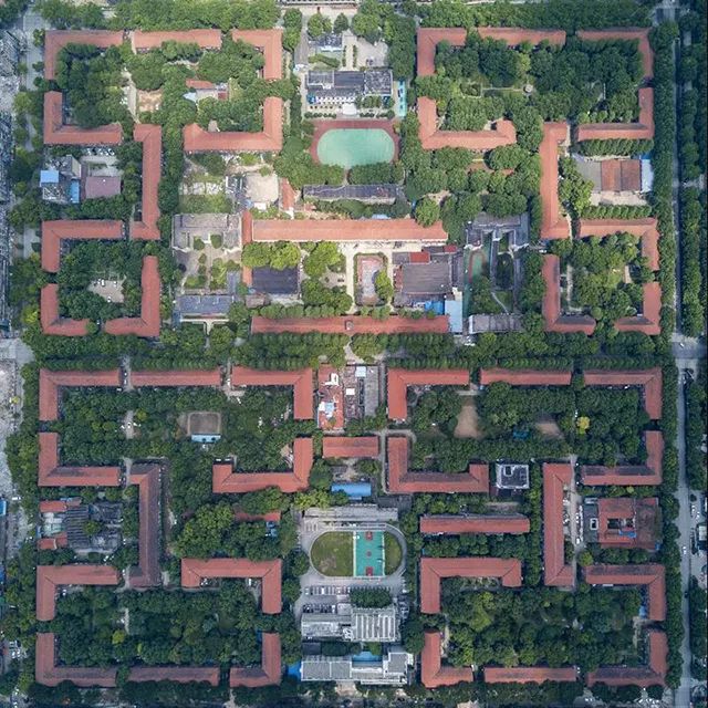 从高空中俯瞰,宛如一个“囍”字,红砖、红瓦、红墙,见证着青山的发展。