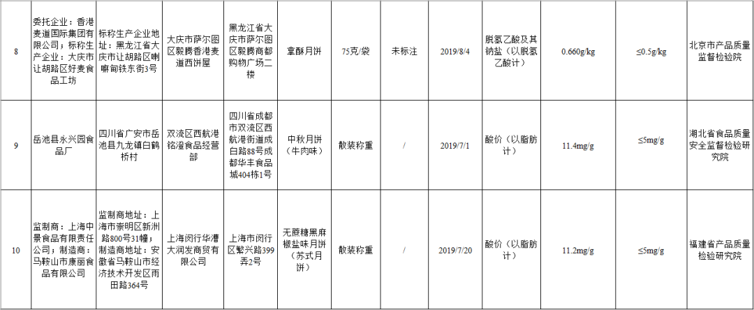 (四)黑龙江省大庆市萨尔图区毅腾香港麦道西饼屋销售的、标称香港麦道国际集团有限公司委托黑龙江省大庆市让胡路区好麦食品工坊生产的传统月饼和拿酥月饼,脱氢乙酸及其钠盐(以脱氢乙酸计)不符合食品安全国家标准规定。检验机构为北京市产品质量监督检验院。