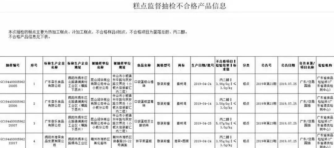 7月26日,广东省市场监督管理局发布关于10批次食品不合格情况的通告。通告披露,8批次糕点样品抽查不合格,不合格项目涉及丙二醇、菌落总数等。腊树湾、欣欣、心华、港荣等品牌上榜。