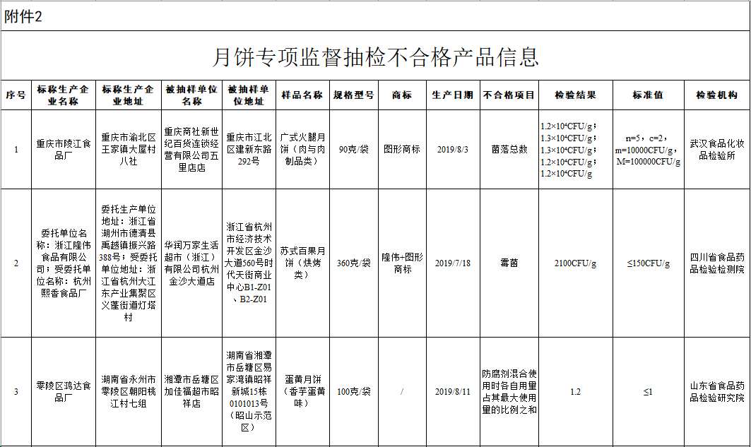 (一)重庆商社新世纪百货连锁经营有限公司五里店店销售的、标称重庆市陵江食品厂生产的广式火腿月饼(肉与肉制品类),菌落总数不符合食品安全国家标准规定。检验机构为武汉食品化妆品检验所。