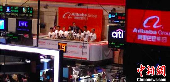 阿里巴巴美国纽约当地时间9月19日上午9点半在纽交所上市,马云邀请8名客户敲响开市钟。刘育英 摄