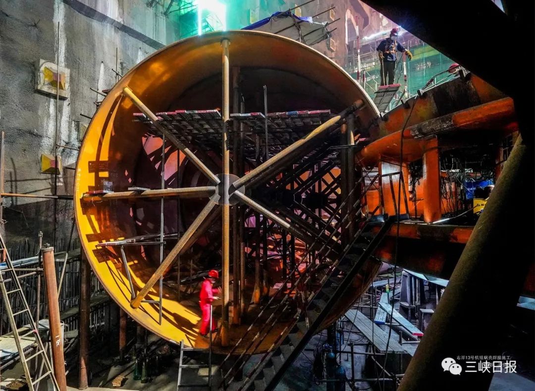 ▲右岸13号机组蜗壳焊接施工。摄影:肖佳法