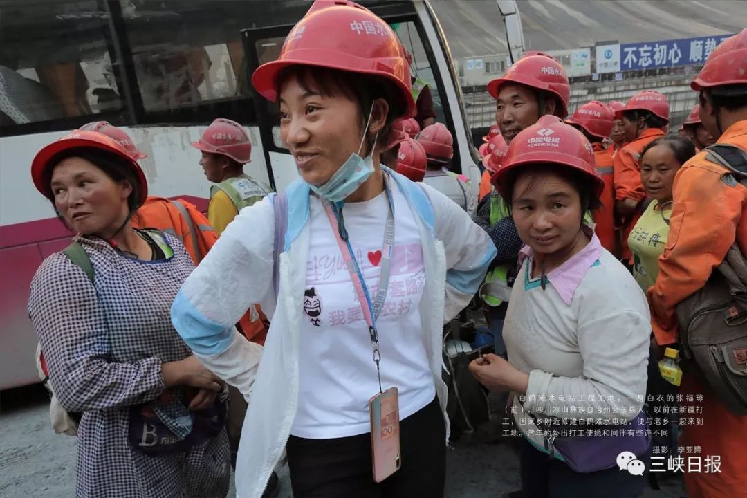 ▲白鹤滩水电站工程工地。一身白衣的张福琼(前),四川凉山彝族自治州会东县人,以前在新疆打工,因家乡修建白鹤滩水电站,便与老乡一起来到工地。常年的外出打工使她和同伴有些许不同。摄影:李亚隆