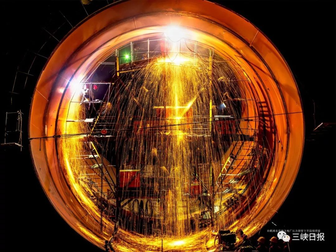 ▲白鹤滩右岸地下电厂压力钢管下平段组焊接。摄影:黄正平