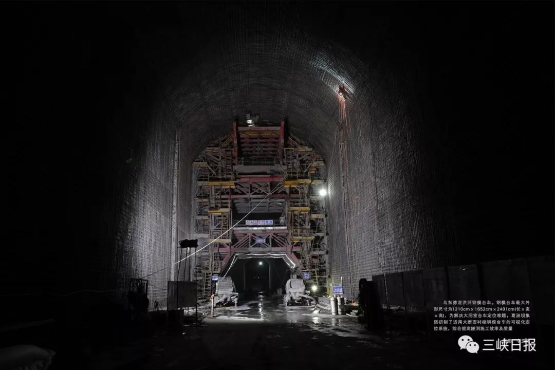 乌东德泄洪洞钢模台车。钢模台车最大外形尺寸为12米*16米*24米(长*宽*高),为解决大洞室台车定位难题,葛洲坝集团研制了适用大断面衬砌钢模台车的可视化定位系统,综合提高隧洞施工效率及质量。摄影:李亚隆