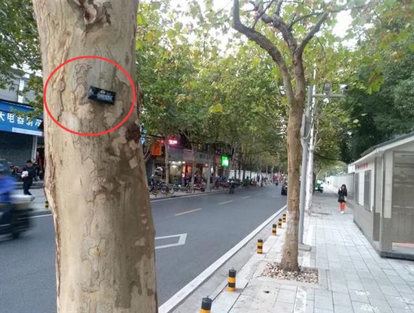 21日,记者在武昌白鹭街与东亭路上看到,路边的法桐树和樱花树树干上,被人钉上了几个小黑袋子,袋子中,有一个透明试管,试管口被棉花塞住。