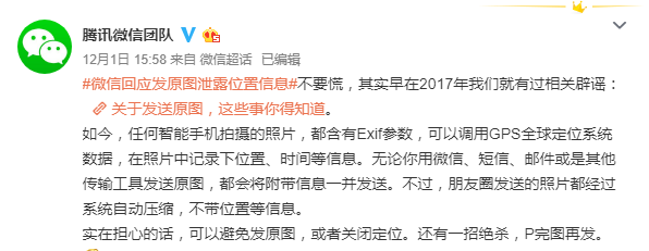 此前有媒体报道,近日,有消息称微信发照片时选择“发送原图”,可能会泄露拍摄定位,有专家表示的确如此,但需同时满足3个条件: