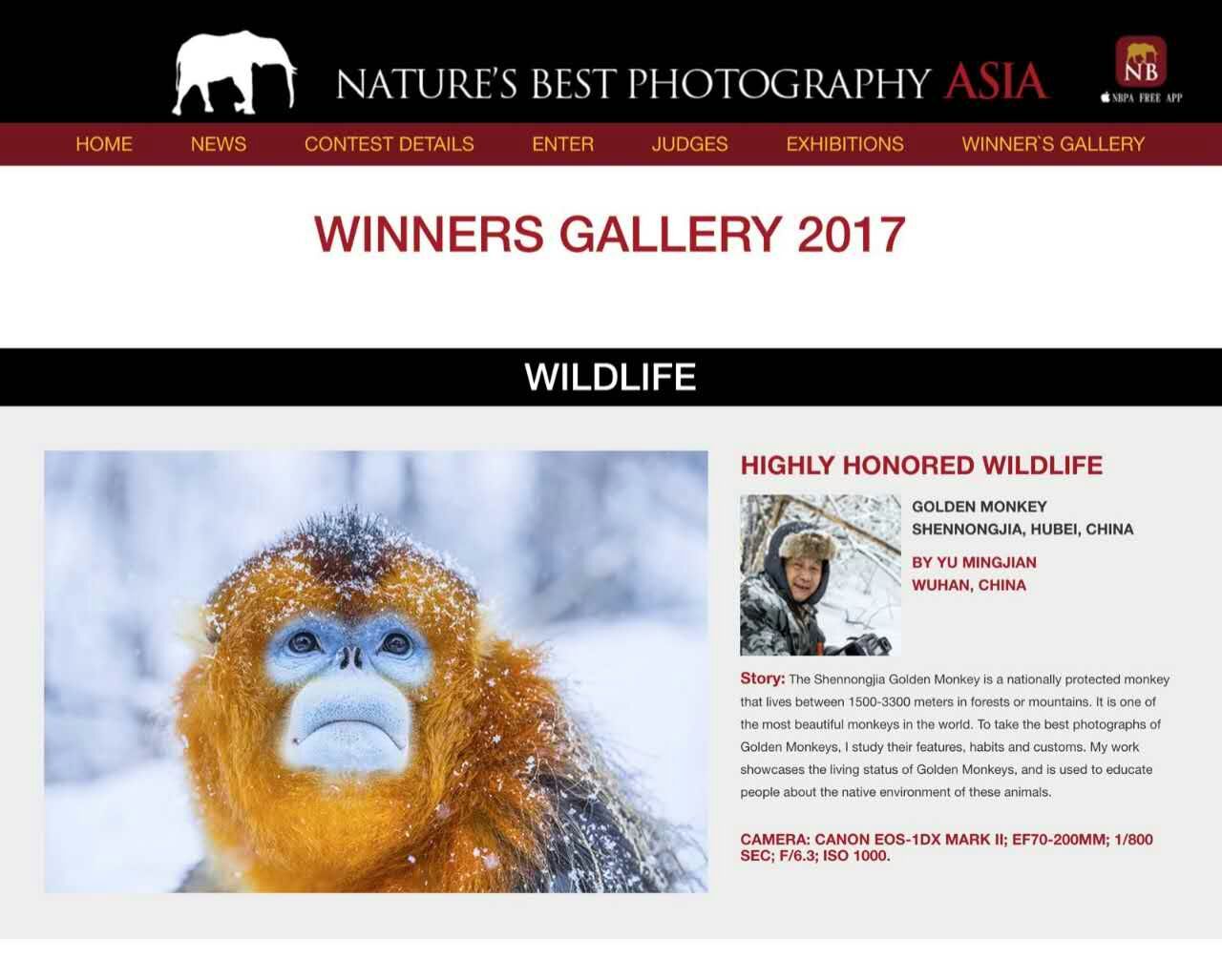第三届亚洲最佳自然摄影奖结果揭晓,中国摄影师余明建凭作品《神农架金丝猴》一举斩获野生动物组最佳荣誉奖。该奖是大赛举办三届以来,唯一一个中国人获野生动物类奖。