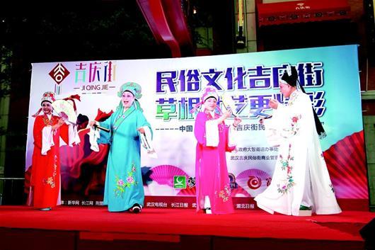 打造百姓大舞台。在吉庆民俗街内庭广场,有一个“吉”字形的舞台,常年开展各类舞台演出和群众活动。江岸区第38届滨江之春艺术节之“唱美江岸”歌唱大赛、民俗文化才艺大赛,以及日常举办的楚剧、汉剧、评书、木偶剧、变脸和口技等传统舞台节目,广受居民群众好评。开街时,吉庆民俗街还邀请何祚欢、周锦堂、陆鸣、尹北琛、许勇、郑志方等知名人士,现场演绎湖北评书、汉派小品和相声。