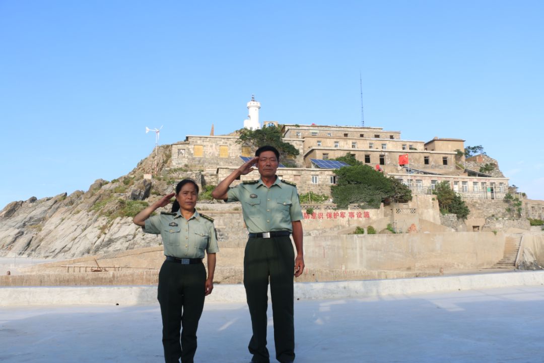 王继才夫妇在开山岛举行向国旗敬礼仪式