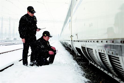 图为:承担高铁检修任务的武汉动车段“以雪为令”,成立了由110名人员组成的11支除雪打冰小分队,24小时对动车组积雪进行及时清除,并针对入库线路、道岔进行巡查和涂刷防冻油,确保列车运行安全。(视界网许辉摄)