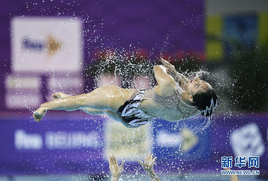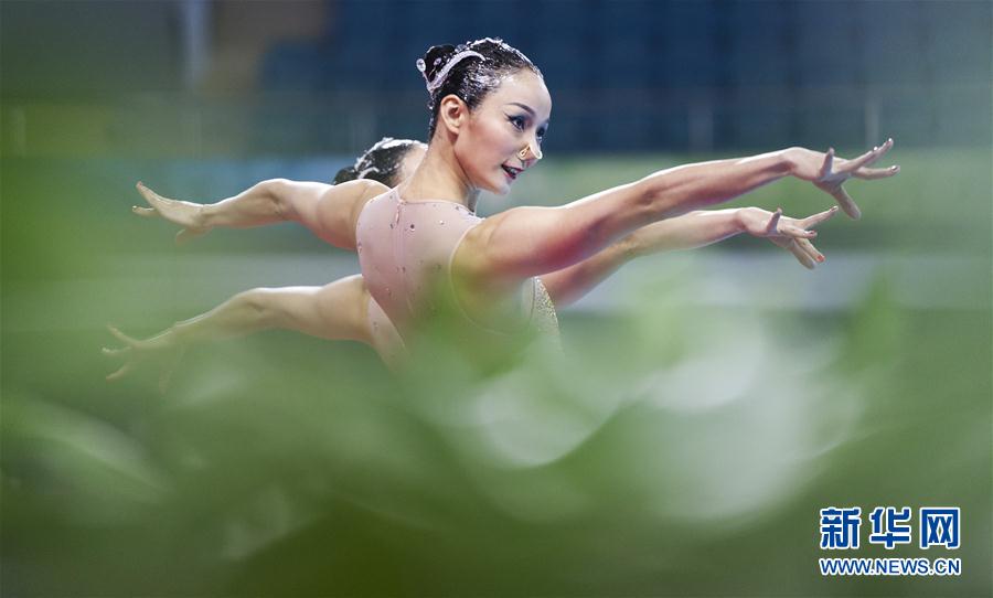 2018年4月20日,四川队选手蒋文文/蒋婷婷在双人自由自选比赛中。 当日,全国花样游泳冠军赛暨FINA花样游泳世界系列赛(中国站)在北京英东游泳馆开幕。 新华社记者费茂华摄
