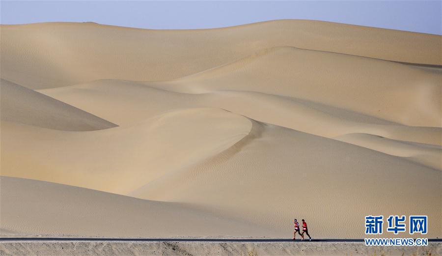 2018年10月21日,选手在沙漠半程马拉松赛中。 当日,为期三天的2018中国体育旅游露营大会(罗布人村寨站)在新疆维吾尔自治区巴音郭楞蒙古自治州尉犁县落幕。本届大会由中国登山协会、新疆维吾尔自治区体育局等单位主办,设竞技项目、群众参与项目等,包括沙漠半程马拉松挑战赛、沙漠越野骑行挑战赛、走扁带等比赛,吸引了近千名来自全国各地的户外运动爱好者参加。 新华社记者陶希夷摄